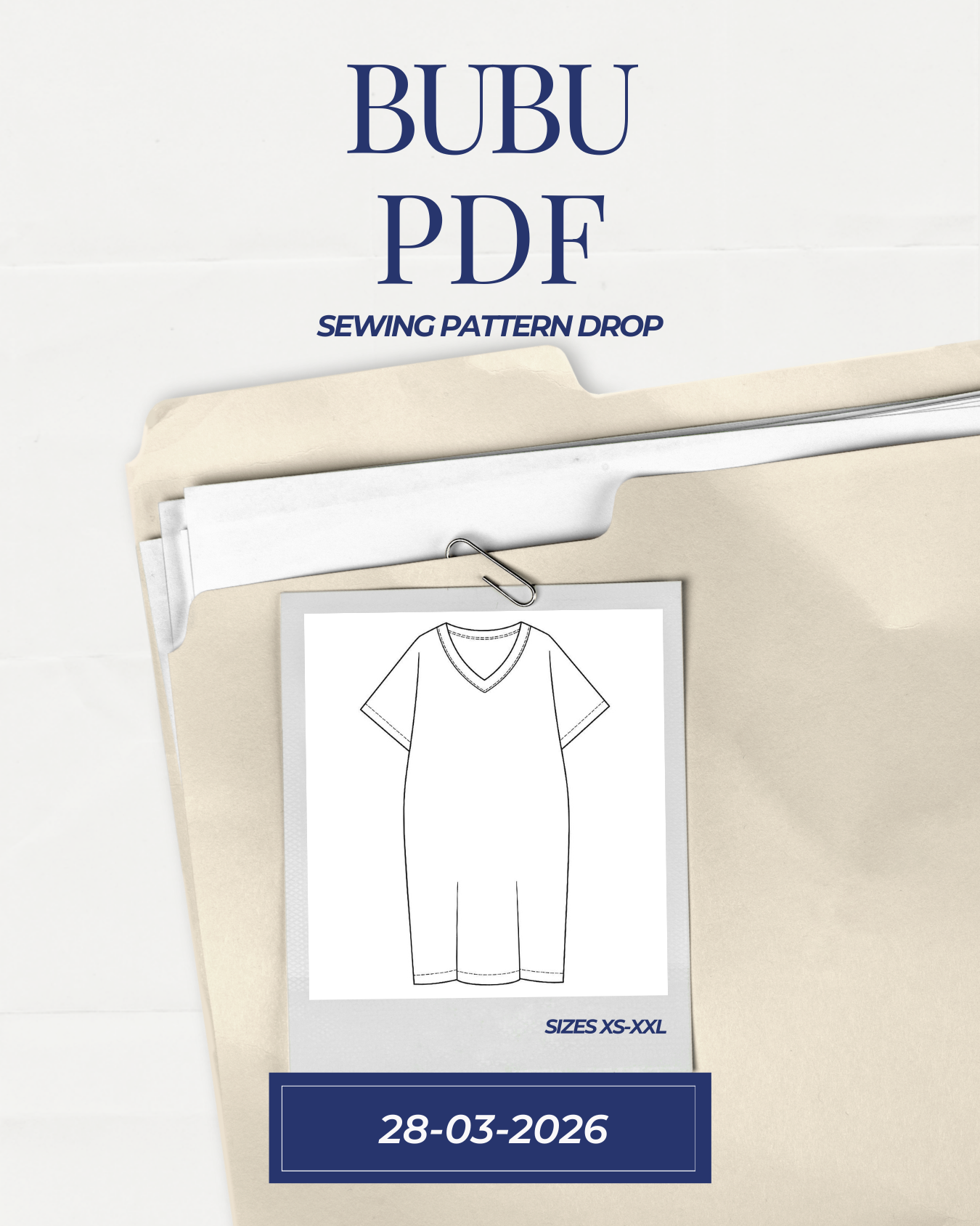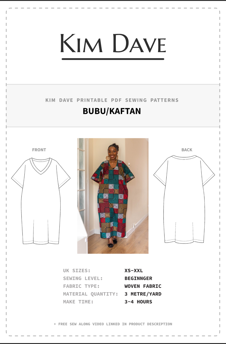 Digital PDF sewing pattern for a stylish Bubu/Kaftan dress. Features a loose fit, three-quarter sleeves, inseam pockets, V-neckline, and one-piece sleeve construction for easier sewing.
